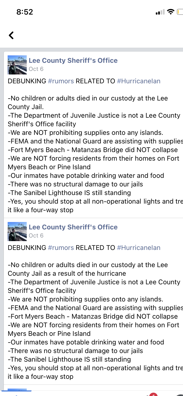 What is particularly interesting is the edit history debunking the “rumors” about the lee county jail. In their original post they stated “-No children or adults died in our custody at the Lee County Jail.” to “-No children or adults died in our custody at the Lee County Jail as a result of the hurricane”
